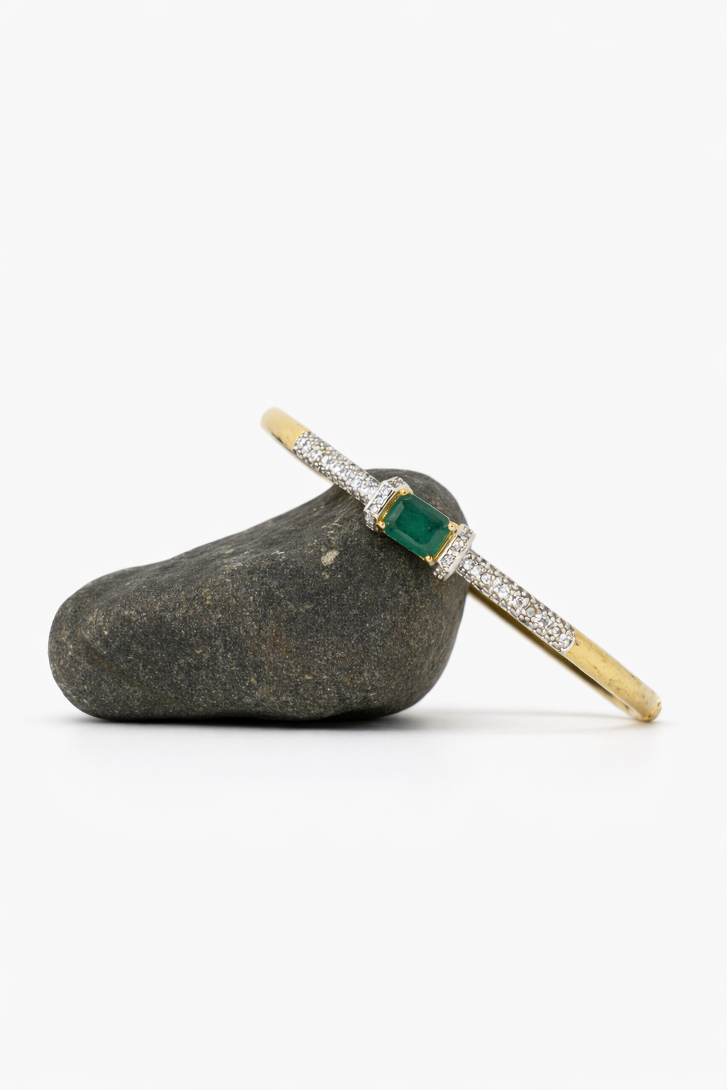 At the center rests a striking emerald-green square-cut stone, framed by delicate pavé detailing that enhances its depth and brilliance. The slim band is accented with fine stone work, creating a balanced silhouette that feels graceful yet contemporary. Sophisticated and versatile, this kada is perfect for both everyday elegance and special occasions.