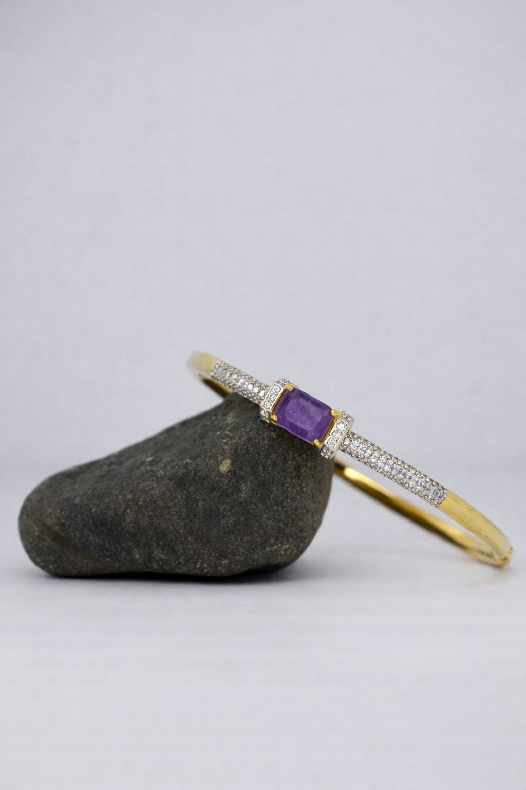 A sleek gold-toned kada featuring a violet square-cut centerpiece with refined pavé accents.