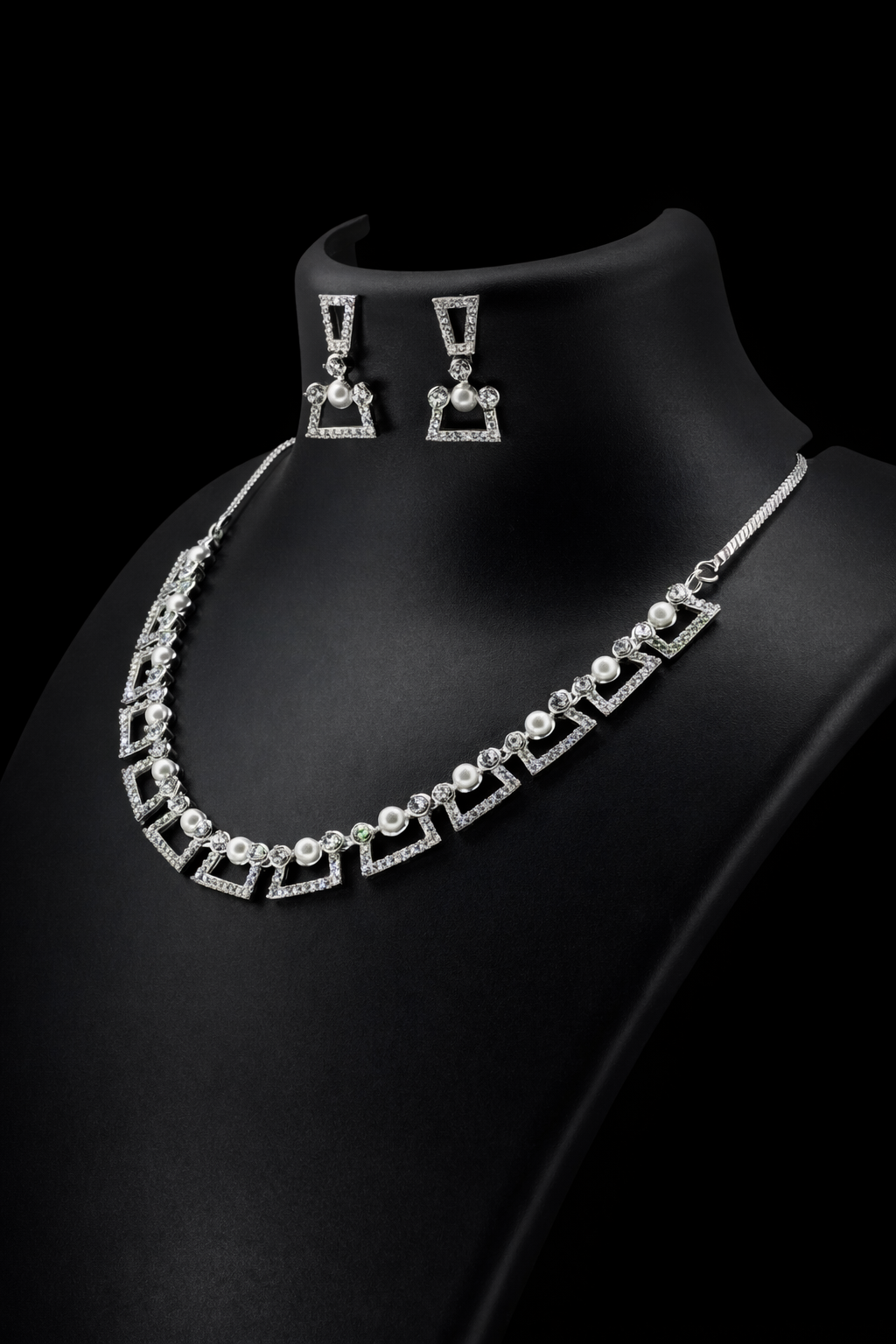 The necklace features structured geometric open-frame motifs accented with shimmering American diamonds and evenly spaced pearl details, creating a striking balance between sharp lines and soft elegance. The matching earrings mirror the geometric silhouette with pearl accents, completing a confident and polished look. Perfect for evening wear and statement styling, this set brings modern glamour with refined charm.