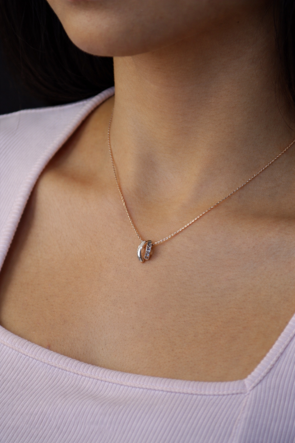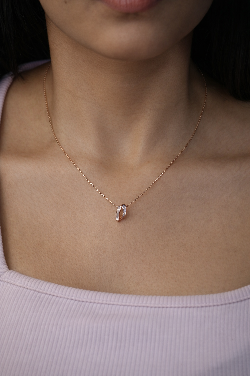 A refined rose gold–toned chain featuring a modern open-loop pendant accented with neatly set stones for subtle brilliance. Crafted from silver 92.5 with an anti-tarnish coating, this chain blends contemporary design with everyday elegance, making it perfect for both minimal and dressy looks.