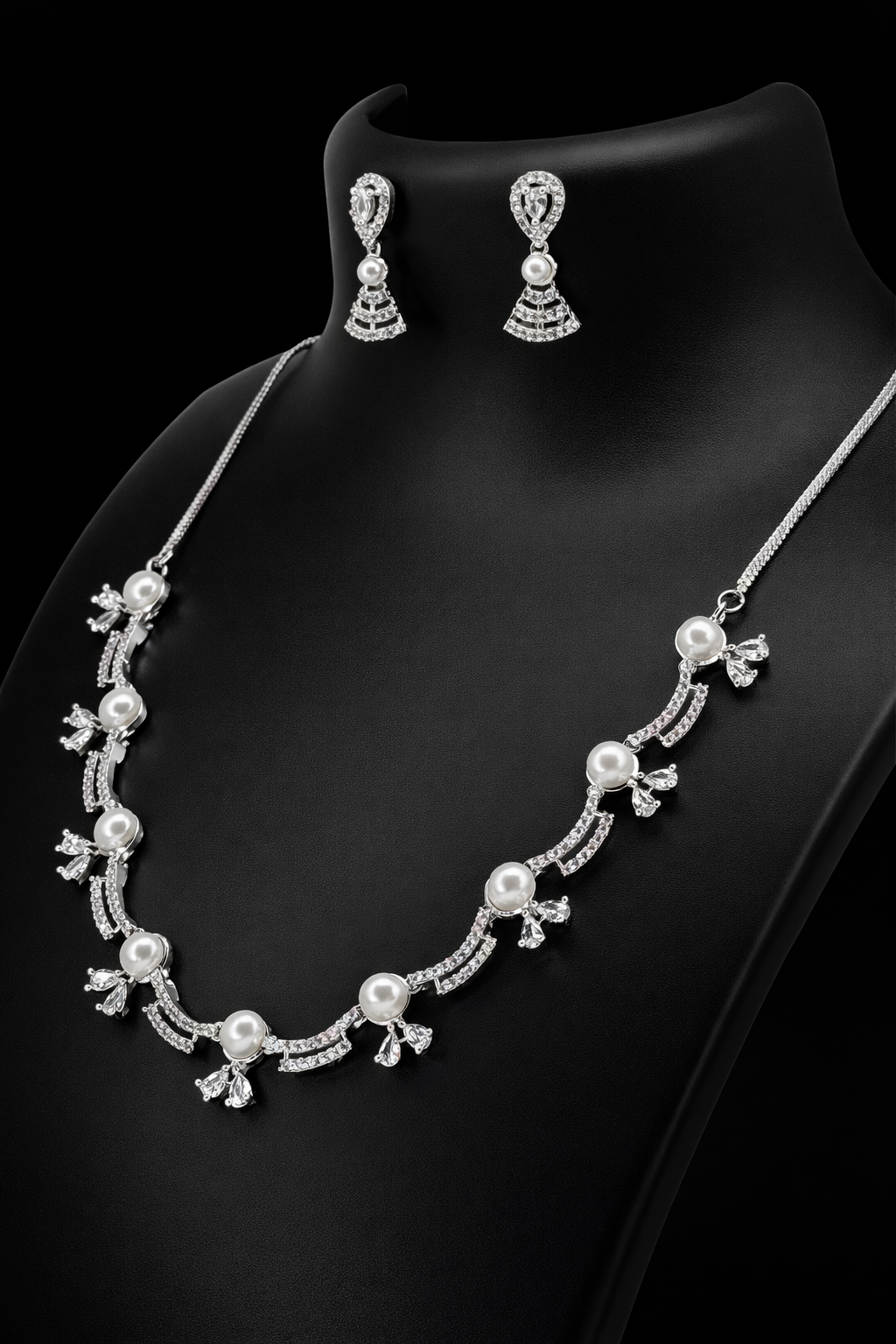 A graceful American diamond necklace set featuring pearl accents and delicate dangling crystal details.
