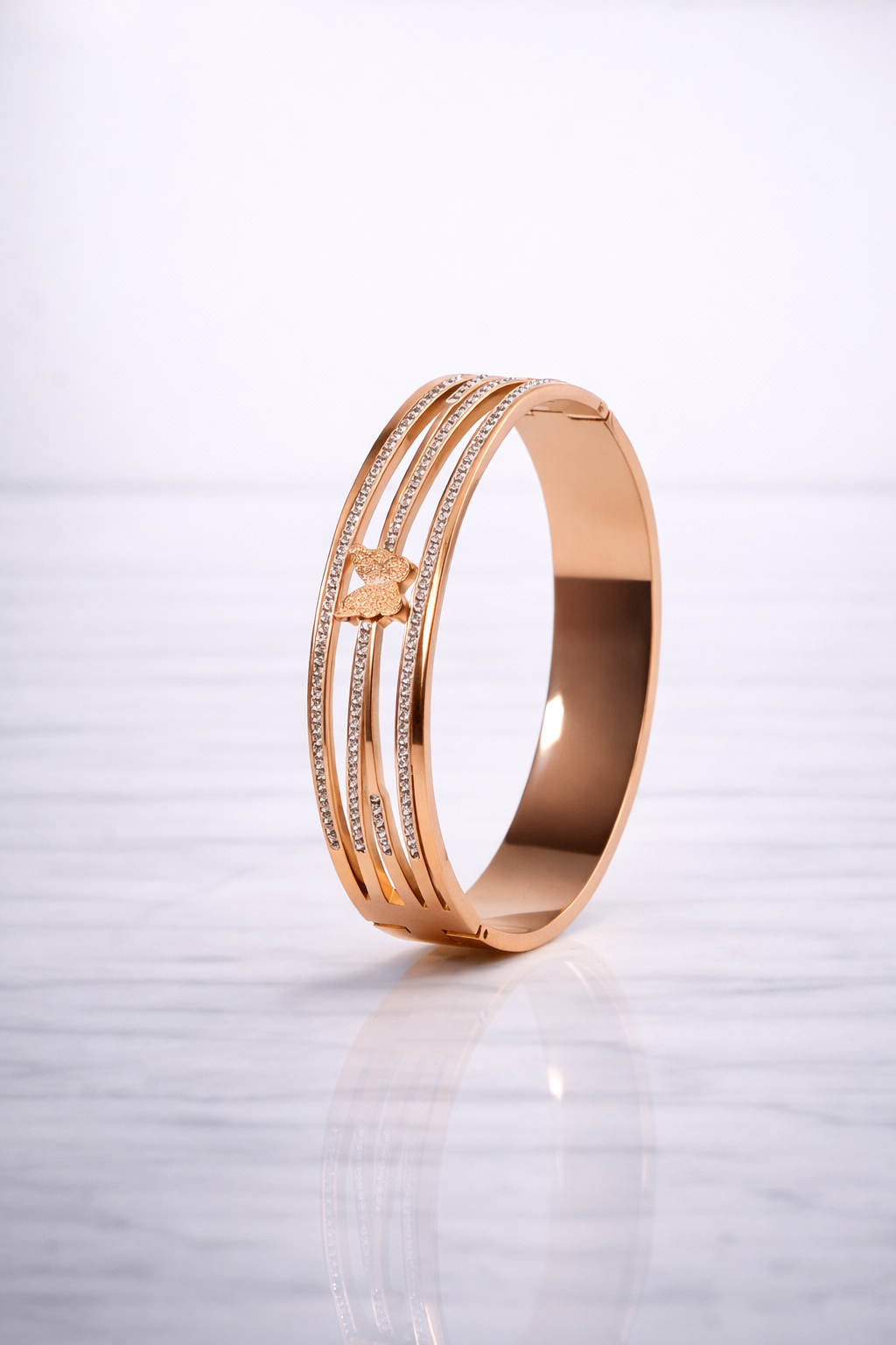 Delicate yet powerful, the Butterfly Rose Gold Kada is designed for everyday elegance. Crafted in a soft rose gold finish, this kada features a graceful butterfly motif that symbolizes transformation, freedom, and beauty. Subtle detailing and a sleek silhouette make it a timeless piece that blends effortlessly with both casual and occasion wear.