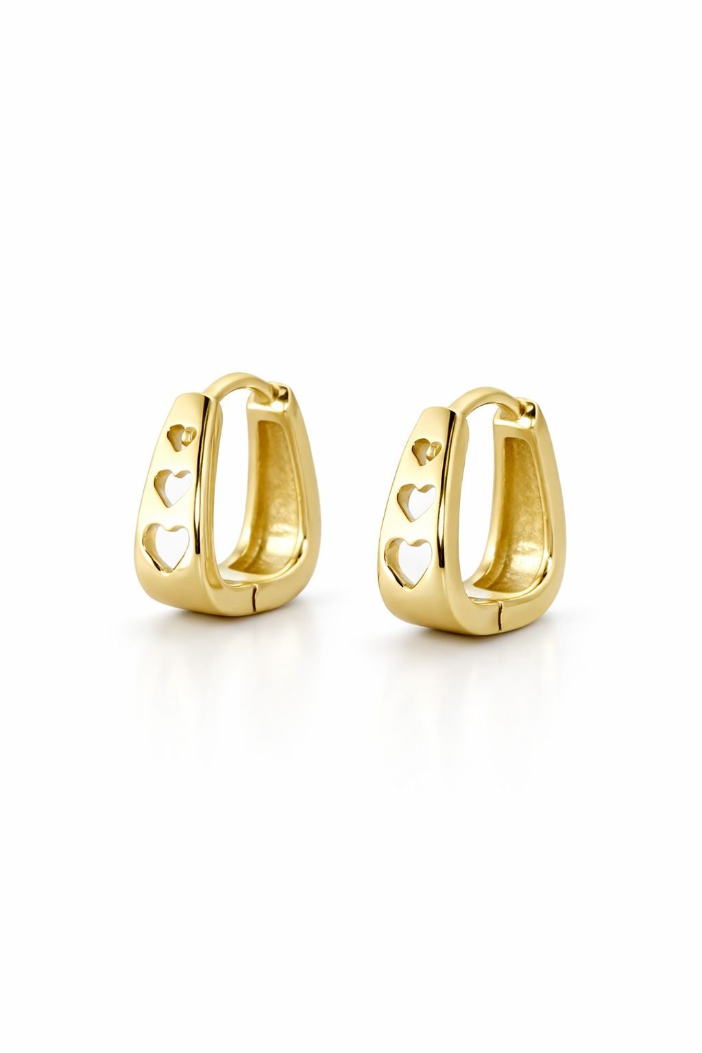 Modern silver hoop earrings with heart-shaped cutout detailing and a polished gold finish.