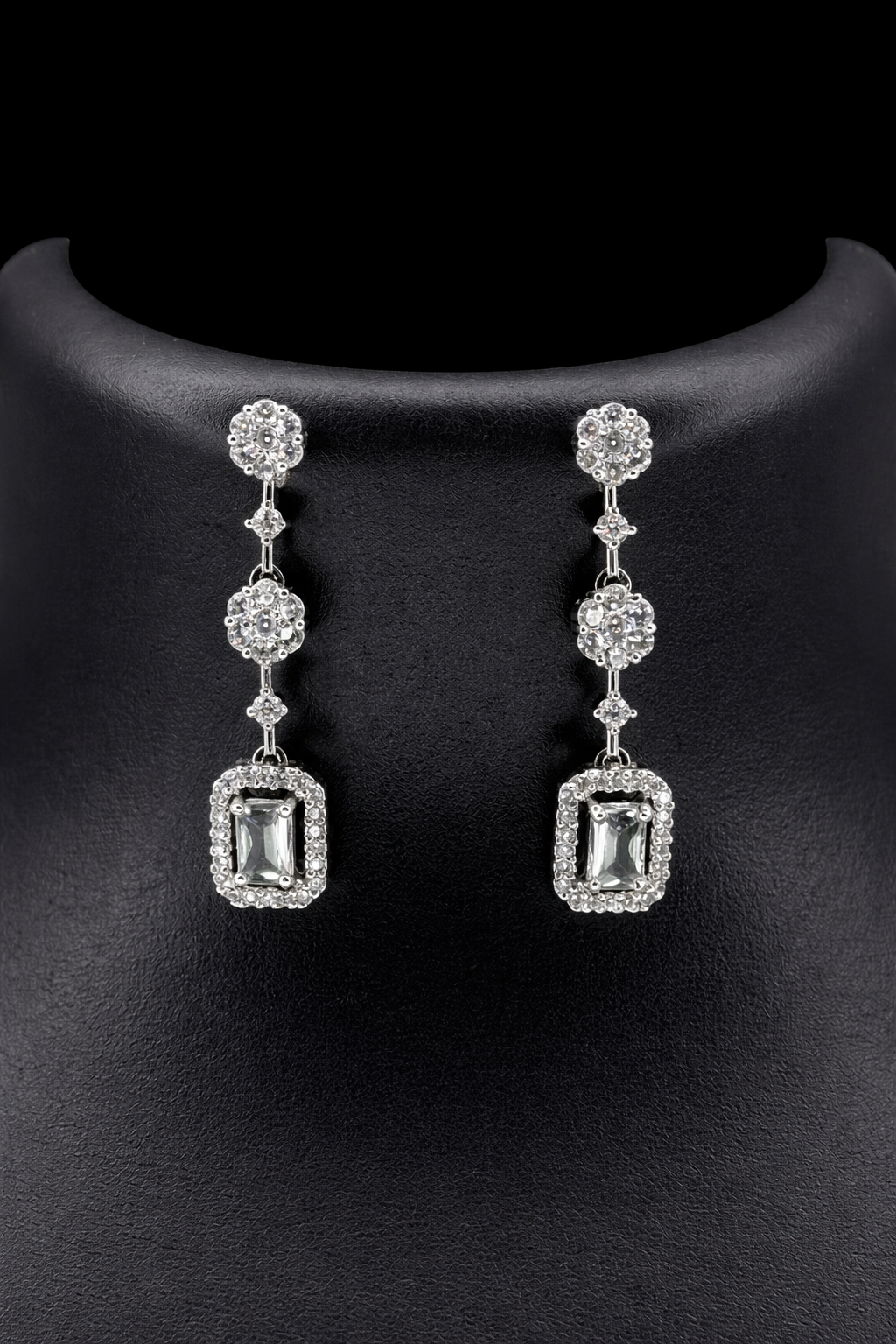 The necklace features a sleek line of round American diamonds leading to a striking square-cut center stone framed by a delicate halo, creating a perfectly balanced focal point. The matching drop earrings mirror the square halo design, adding subtle sparkle and sophistication. Ideal for weddings, evening events, and special occasions, this set delivers classic luxury with contemporary finesse.