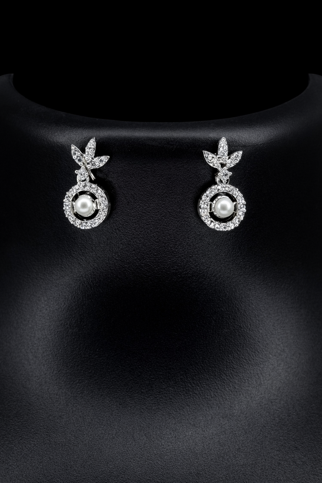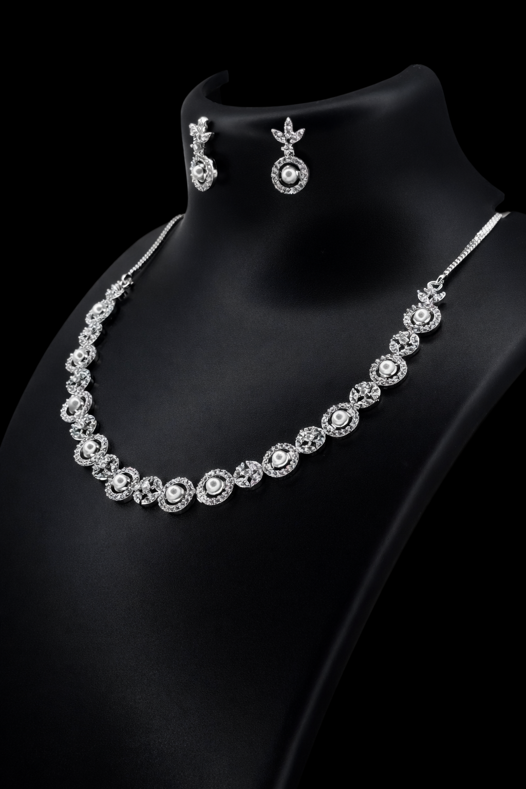 The necklace features a harmonious sequence of circular motifs, each framing a luminous pearl-like center surrounded by sparkling American diamonds. Subtle leaf-inspired accents add a touch of elegance and balance, while the matching earrings mirror the design for a coordinated, polished look. Perfect for celebrations and elegant evenings, this set brings classic charm with a modern finish.