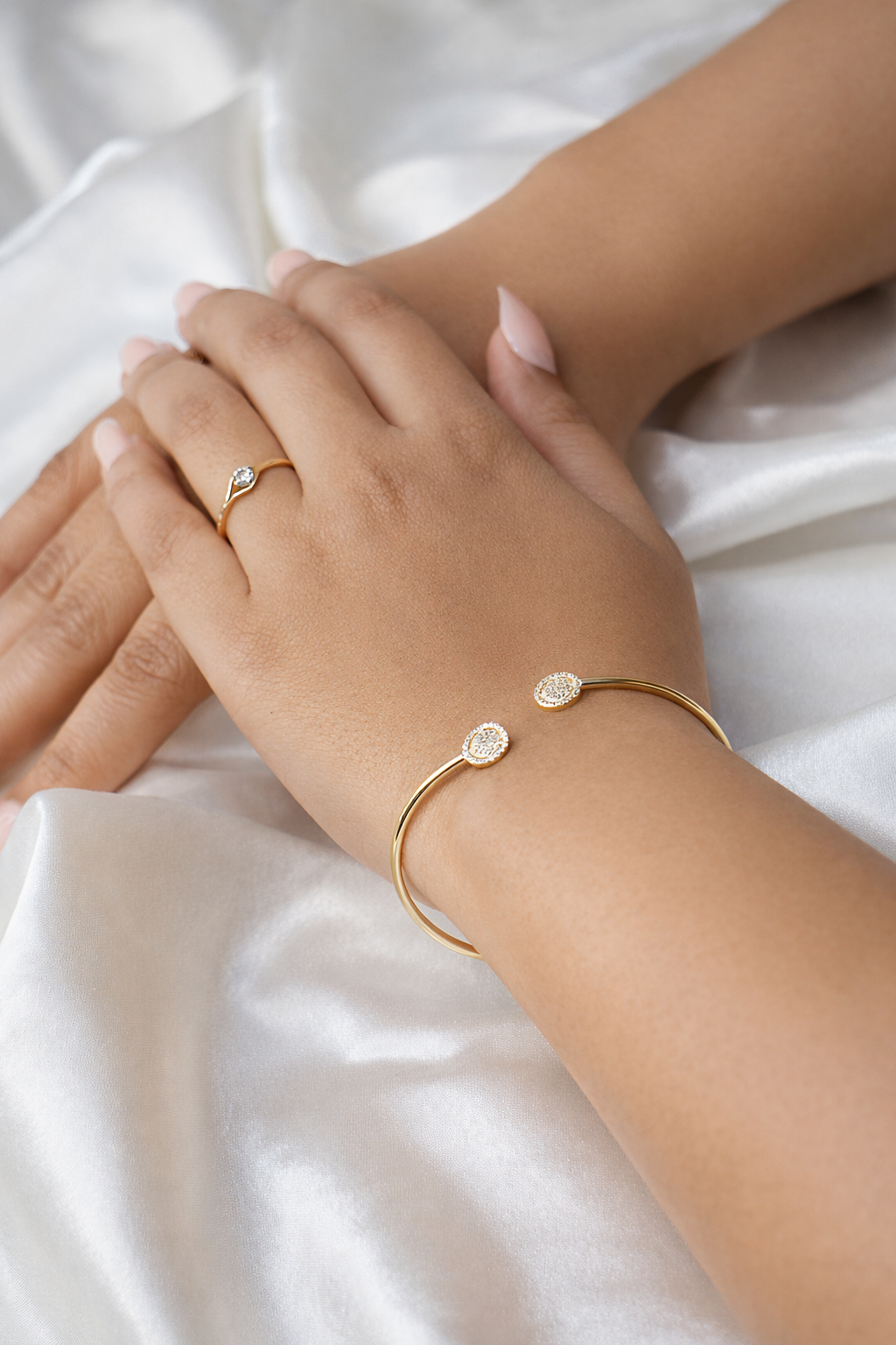 Open silver bangle bracelet with gold polish and circular halo stone accents.
