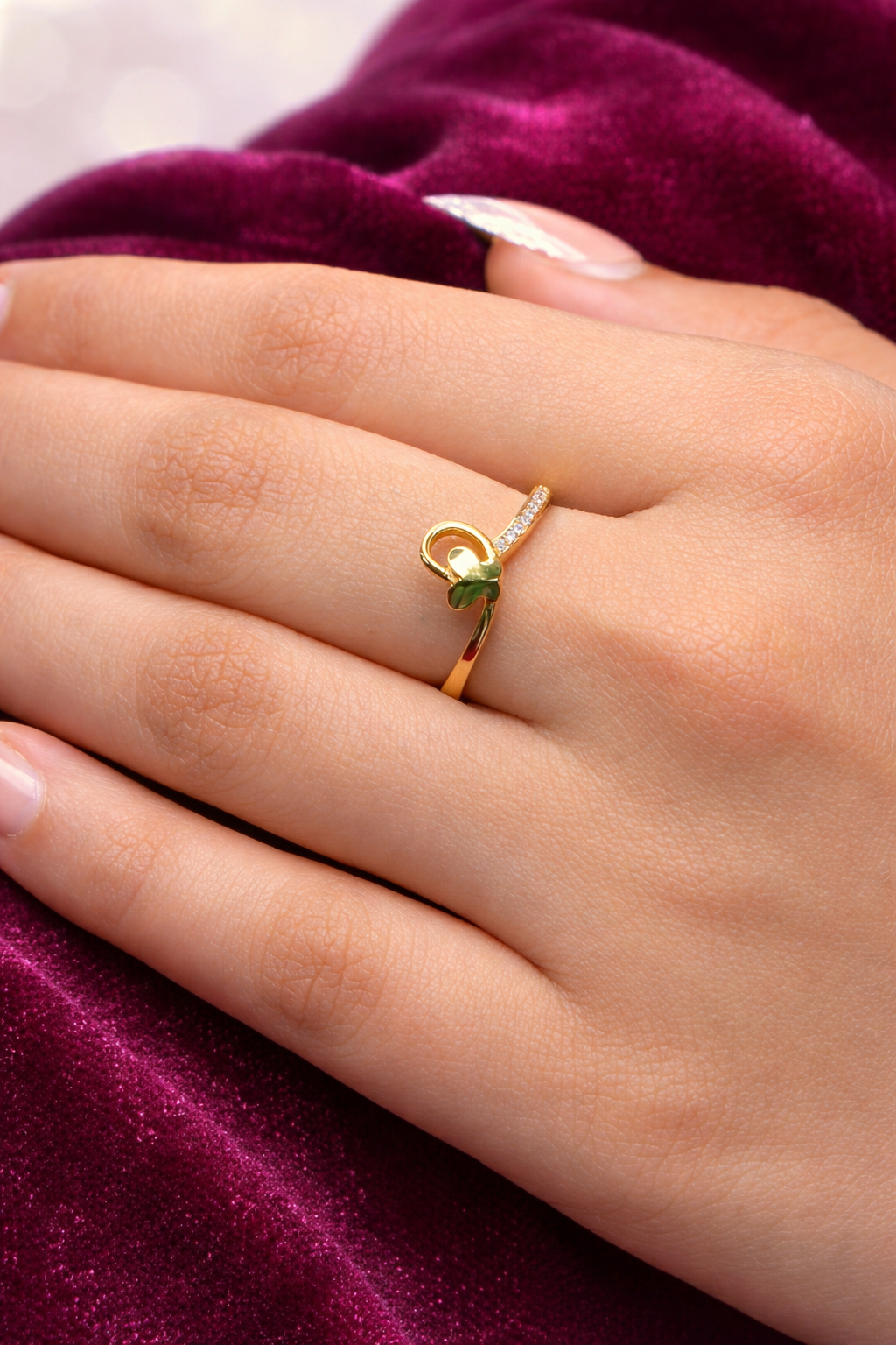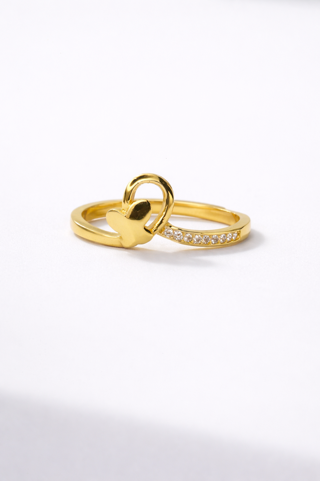 A gold-polished silver ring featuring a heart and loop motif with delicate stone accents.