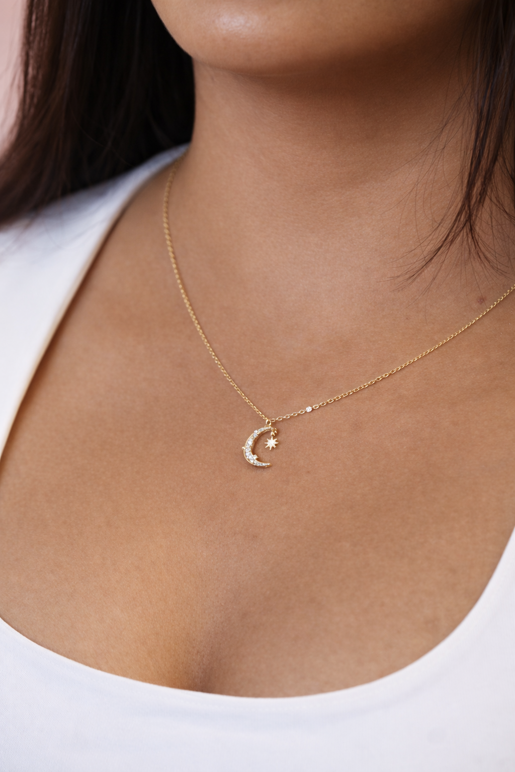 A delicate anti-tarnish chain with a crescent moon and star-inspired pendant.