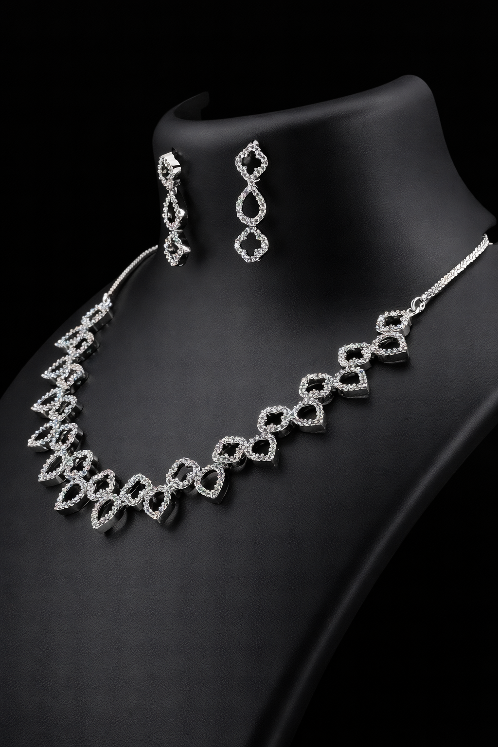 The necklace features a flowing arrangement of open petal-shaped American diamond motifs, creating a light and airy silhouette that rests beautifully along the neckline. The matching drop earrings echo the layered petal design, adding subtle movement and sparkle. Perfect for festive occasions and elegant evenings, this set blends contemporary charm with timeless sophistication.