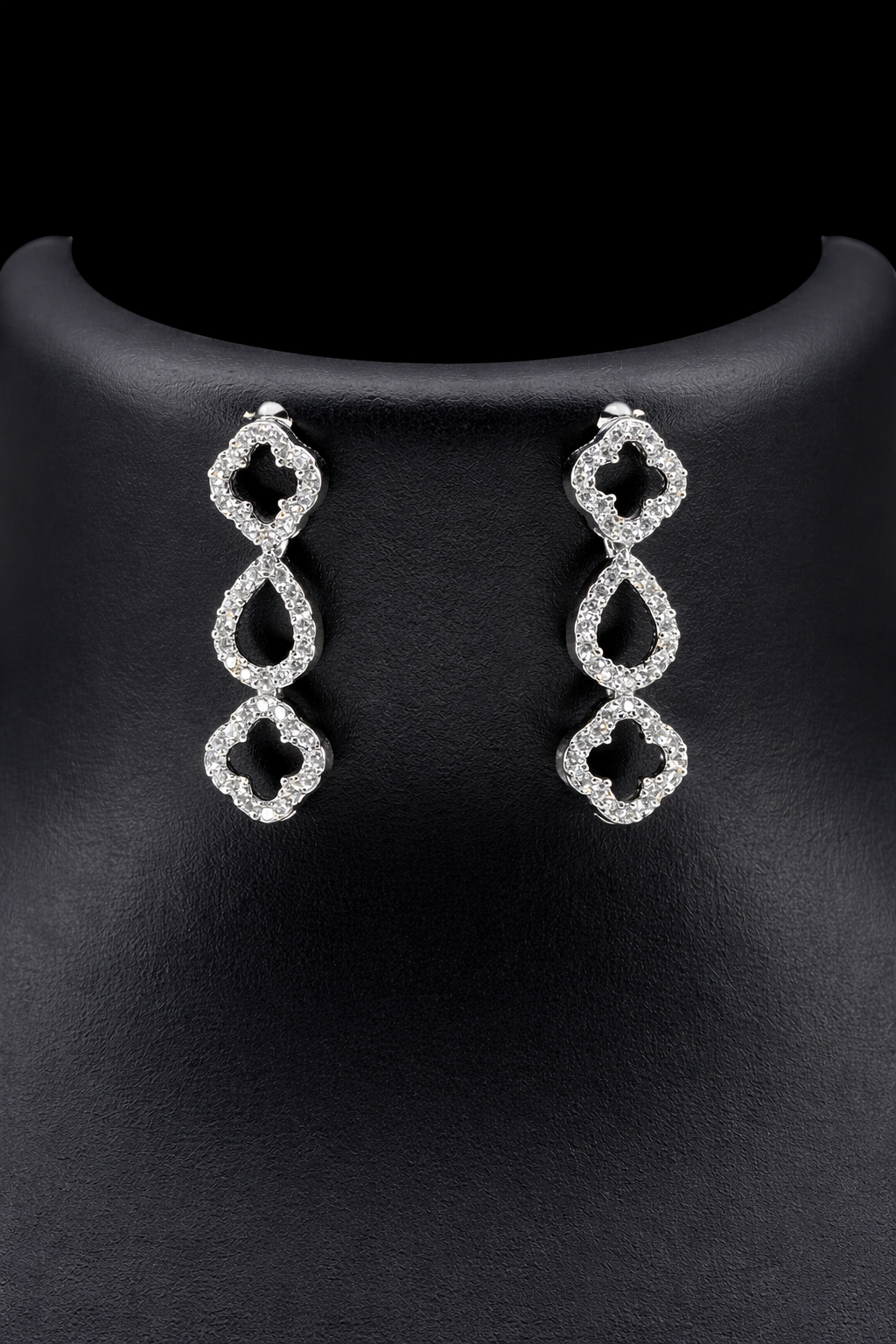 A graceful American diamond necklace set with open petal-shaped motifs and matching drop earrings.
