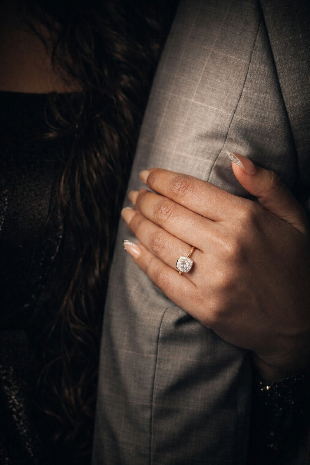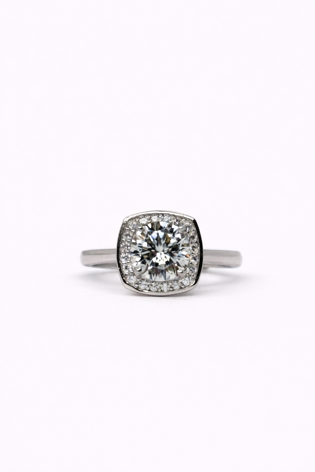 A cushion-shaped halo silver ring with a bold center stone and sleek, minimal band.