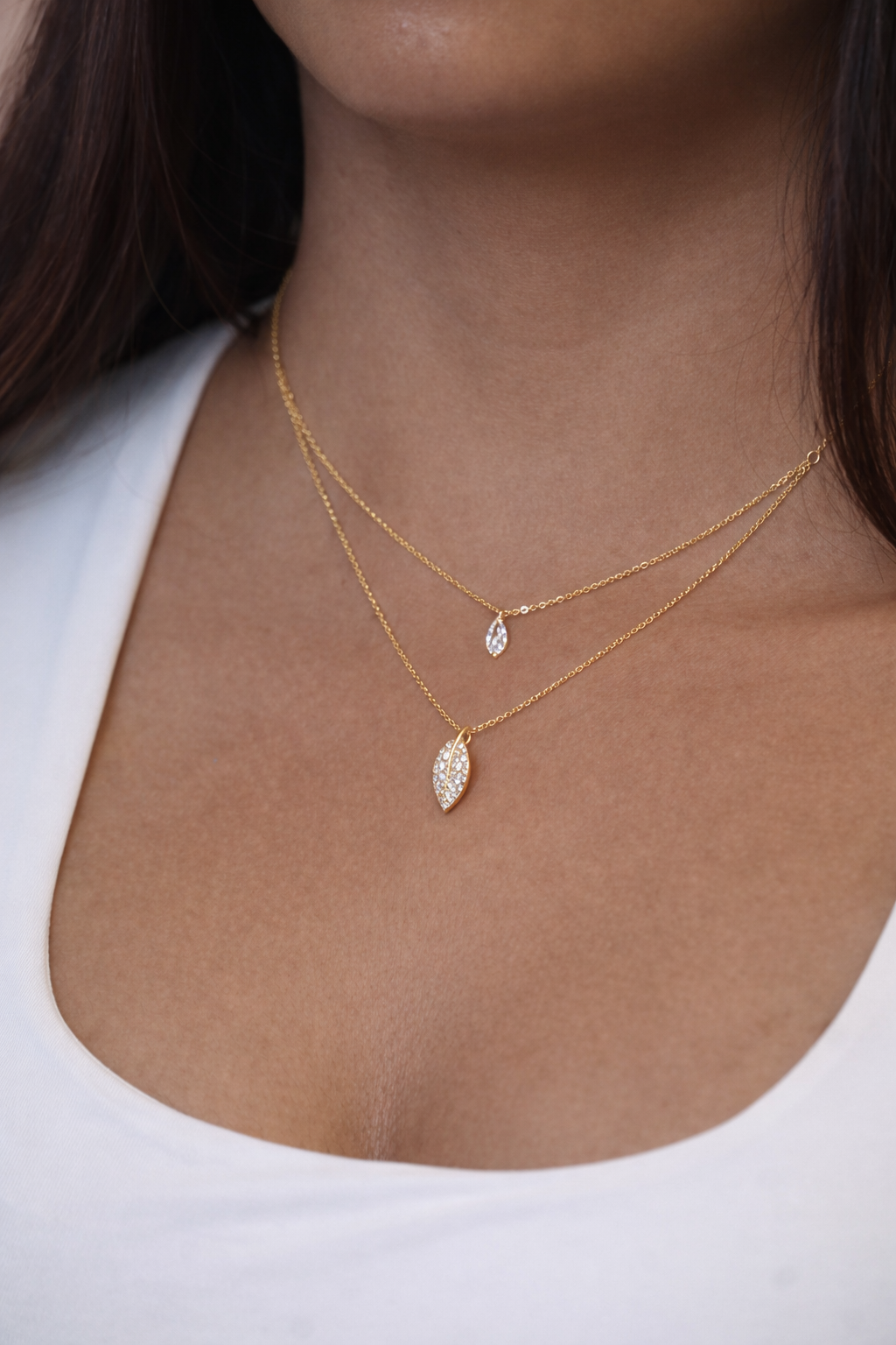 The design features two fine layered chains. The upper layer holds a minimal marquise-shaped accent that adds a subtle sparkle, while the lower layer is finished with a leaf-inspired pendant adorned with fine detailing for a refined finish. Balanced and graceful, this chain creates a naturally layered look that feels effortless and timeless.