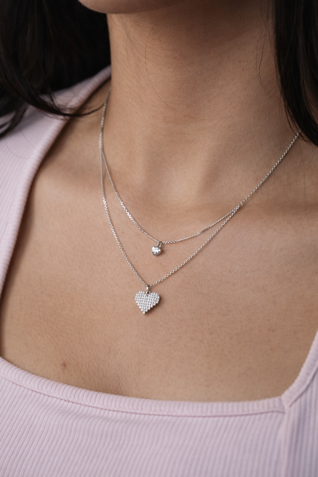 Dual-layer silver chain with modern pixel heart pendants.