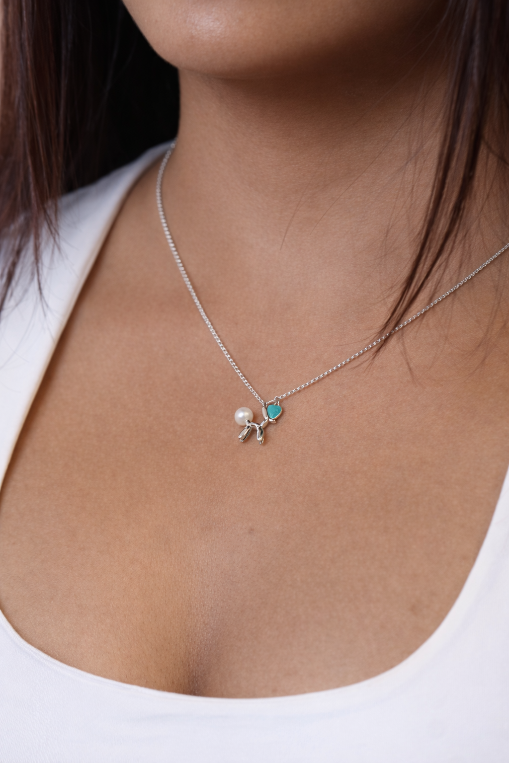 The design features a sleek silver-toned double-layer chain centered with a charming balloon-dog–inspired motif. Accented with a soft pearl detail and a petite heart charm in a subtle pop of color, this chain feels lighthearted while staying elegant. Perfect for adding personality to your everyday look, it’s a delicate statement that feels playful, modern, and effortlessly chic.