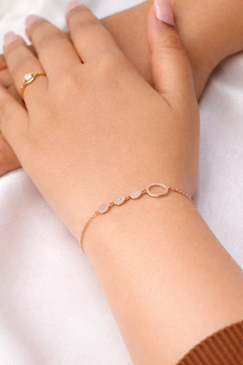 Softly radiant and contemporary, the Rose Trio Orbit Silver Bracelet is designed to add a graceful sparkle to everyday styling. Crafted with a Silver 92.5 base and finished with a premium anti-tarnish coating, this bracelet offers lasting shine and durability. The fine rose gold–polished chain features three circular stone-accented motifs arranged elegantly, complemented by a larger open ring detail that brings a modern, balanced finish. Refined yet eye-catching, this bracelet is perfect for daily wear, layering, or elegant gifting.
