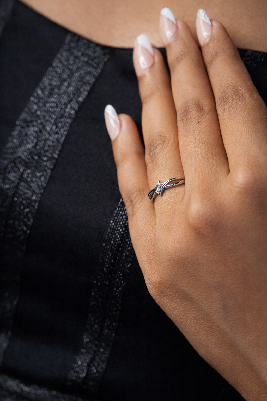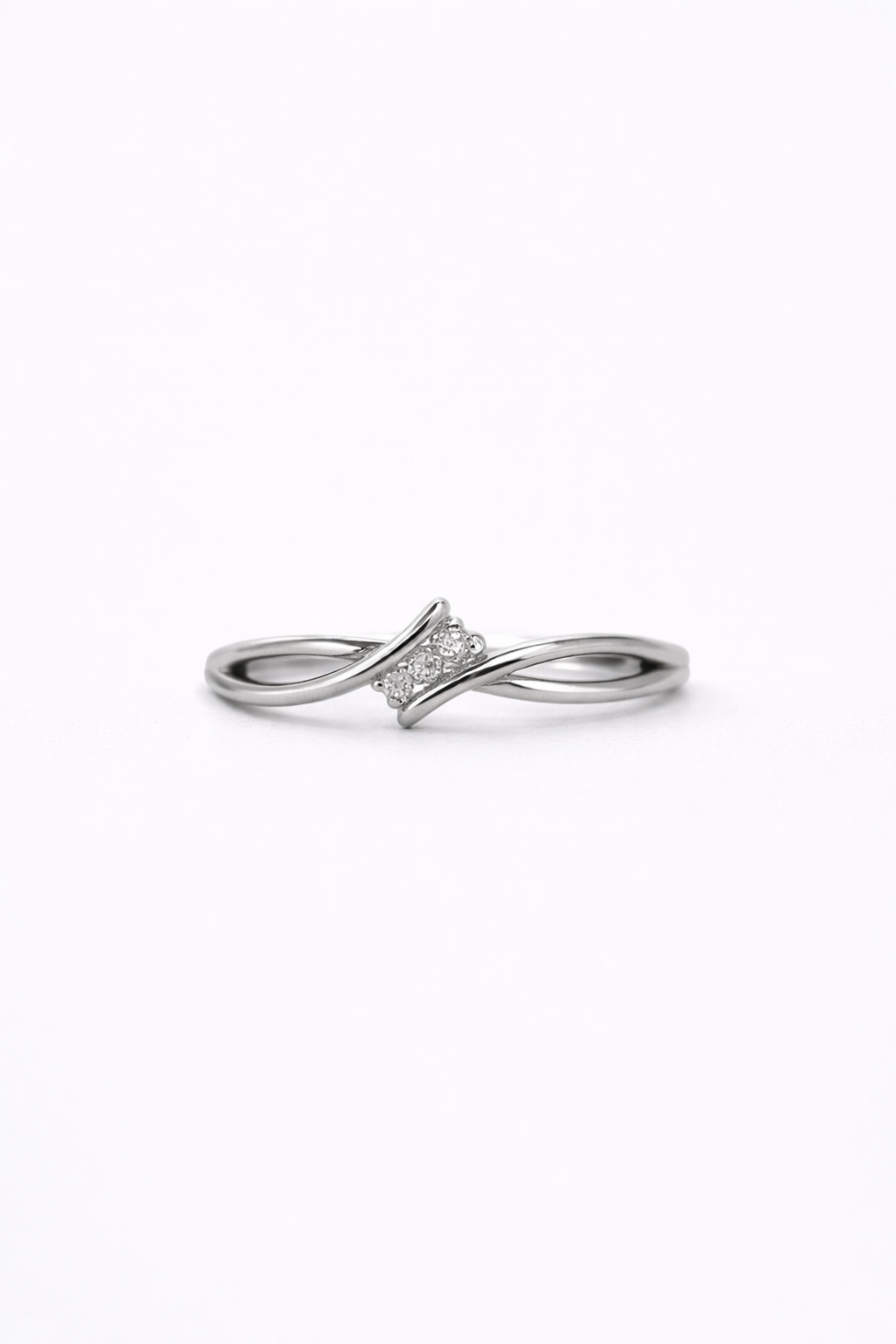 A silver-polished ring with interlocking wave curves and delicate stone detailing.